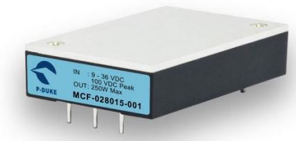 MCF-modellen, der yder 250W og 15A, tåler at arbejde i et omgivelsestemperatur område fra -40°C til +105°C. Denne model er monteret i plast- og aluminium- hus og pottet med silikone (UL94 V-0). Effektiviteten er op til 98 procent. Størrelse på 250W er 57,9mm lang x 36,8mm bred x 12,7mm høj + 5,1mm ben.