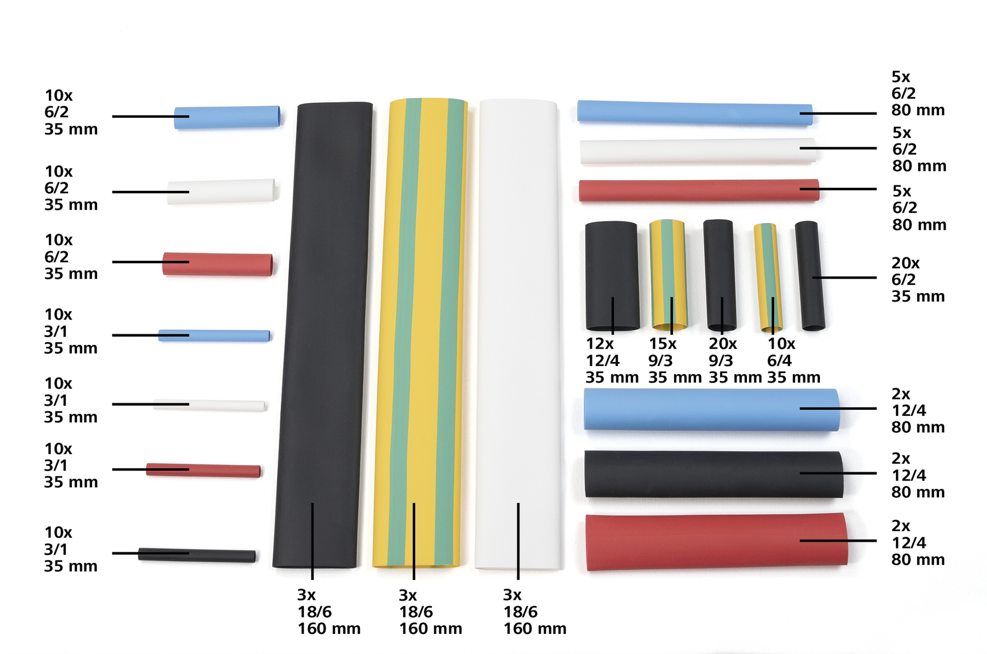 Udover at være fortrinlige til isolering og beskyttelse mod slid, kemikalier og ekstreme vejrforhold, så kan de ligeledes bruges til bundtning og belastningsaflastning. Det er let at vælge det rigtige produkt, eftersom krympeslangerne er tydeligt mærket i hvert rum med størrelse, længde og antal. Dette er reparation-sættet til de små opgaver, der skal løses hurtigt.