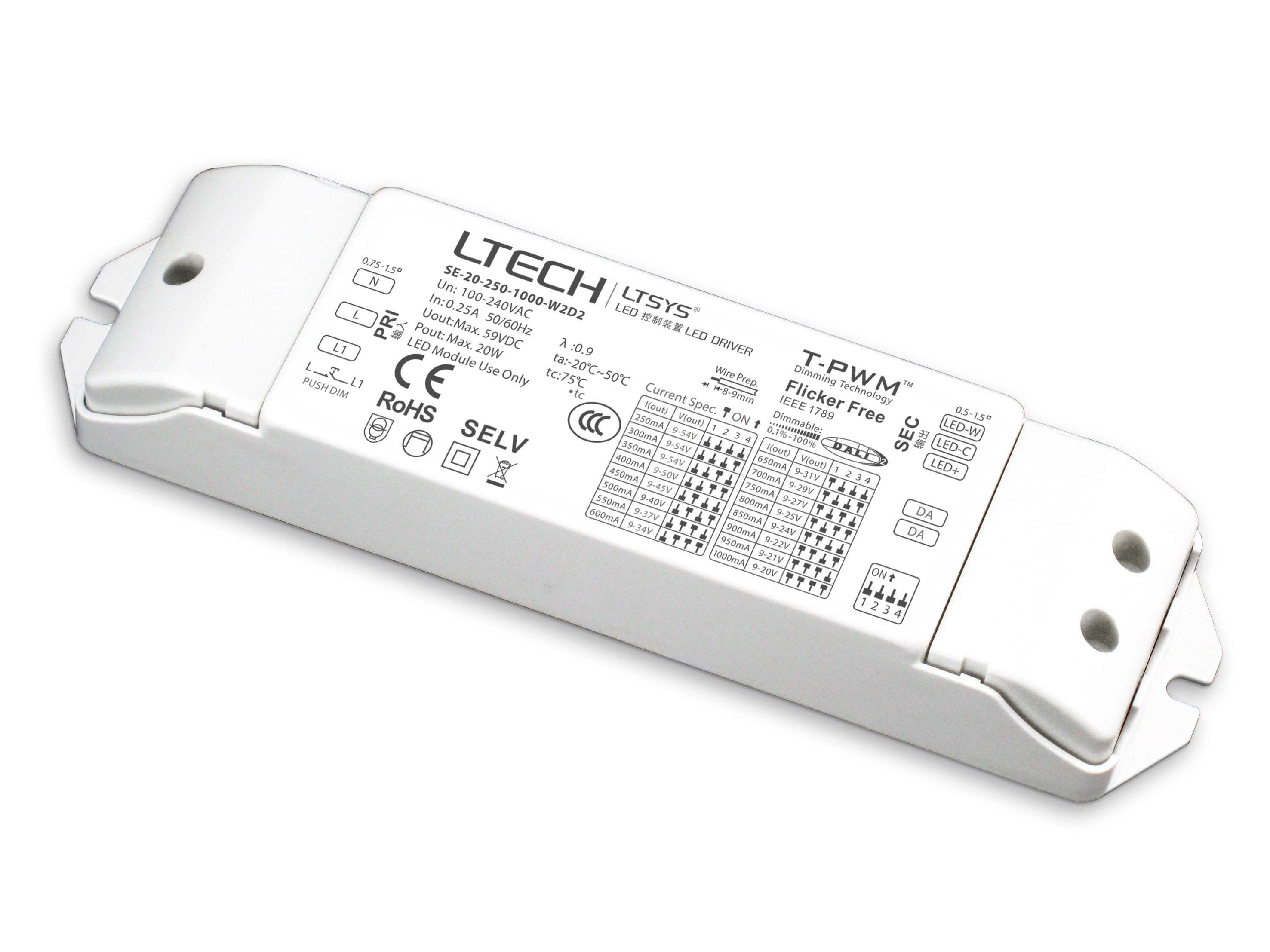 DALI-2, DT6 & DT8 er standard features i SE-20-250-1000-W2D2 fra LTECH. Power Technic forhandler denne Flicker-free og 0.1-100% dæmpbare LED driver, der vha DIP switch har 16 forskellige udgangsstrømme fra 250mA til 1000mA.