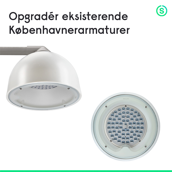 Mange byer og kommuner råder over de klassiske Københavnerarmaturer. I flere tilfælde er armaturerne stadig udstyret med konventionelle lyskilder eller LED løsninger af ældre dato, som ikke lever op til nutidens krav til energieffektivitet og lyskvalitet. Med Signifys Retrofit indsatser er det muligt at modernisere eksisterende armaturer, uden at ændre det velkendte og bevaringsværdige visuelle udtryk i byrummet.