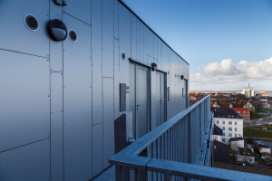 Tæt på fjorden i Aalborg Centrum tårner Nyhavn sig op – et nyt byggeri på 11 etager med 68 ungdomsboliger, erhverv i stueetagen og tagterrasse på toppen. Det er en bygning, man lægger mærke til. Ikke kun fordi den rager 35 meter op i luften, men også fordi facaden er klædt i aluminium, zink og stål.