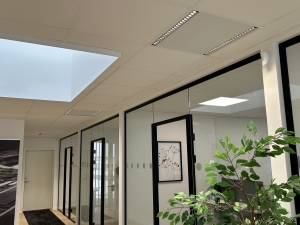 Kontorarealerne er udført med systemlofter, hvor ECOFOSS har leveret løsninger udviklet til montering direkte i loftets skinnesystem. I de åbne kontorområder er der anvendt ALYCE 60×60 panelplader med LED-lysskinner, som fås i sort eller hvid og med lav blænding (UGR16/UGR19) for et behageligt og ensartet arbejdslys.