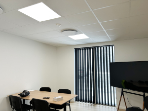 I de øvrige kontorlokaler er der monteret 60×60 cm. LED paneler med CCT-omskift (3.000/4.000 kelvin), høj farvegengivelse på CRI>90, lav blænde på UGR<19 og nem integration i systemlofter. >>Se mere om indbygningspanelet her