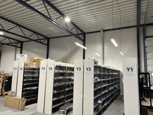 Lagerhallen er primært belyst med COMPETITOR LED high-bay industrilamper, som er forberedt til sensorstyring og sikrer høj effektivitet og reduceret energiforbrug.