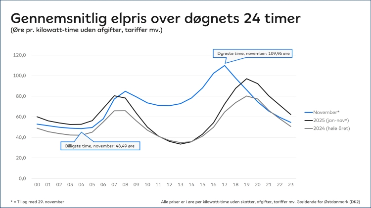 Det gælder også for november. Her topper elpriserne i timen mellem kl. 17 og 18, hvor gennemsnits-prisen pr. 29. november er ca. 110 øre per kilowatt-time. Omvendt er døgnets billigste time mellem kl. 4 og 5 om natten. Her er gennemsnits-prisen nede på ca. 48,5 øre.